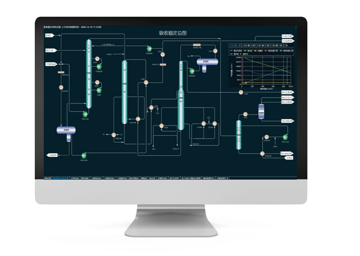 系统具备稳态检测、数据校正与整定功能,可基于实时数据完成全流程模拟。同时,它能对装置的物料与能量平衡、工艺性能及关键设备进行实时监测,并提供基于机理模型的软测量,为运行分析提供依据。